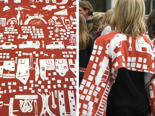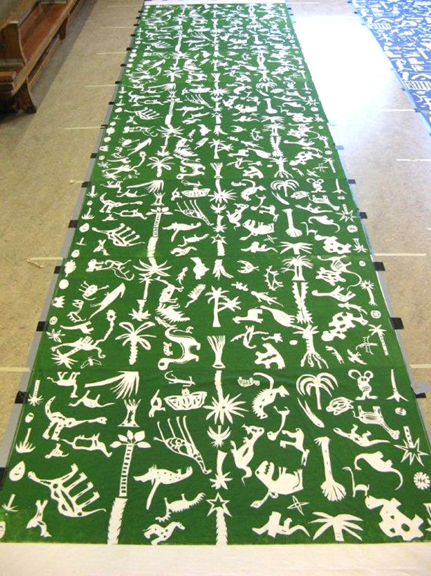 Gedurende 1 volle week worden de witte doeken die op de vloer opgespannen zijn voller en voller tot er 60 meter unieke stof is gedrukt. Na het fixeren komen de stoffen op 10 rollen terug naar de school.