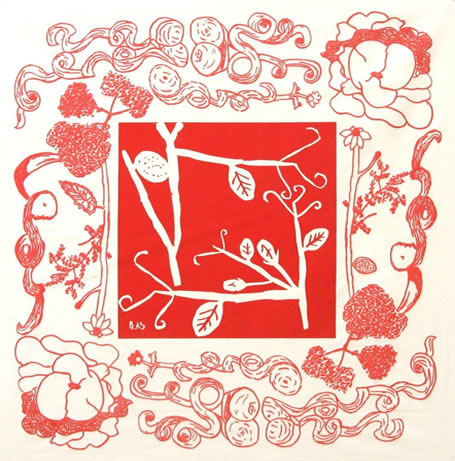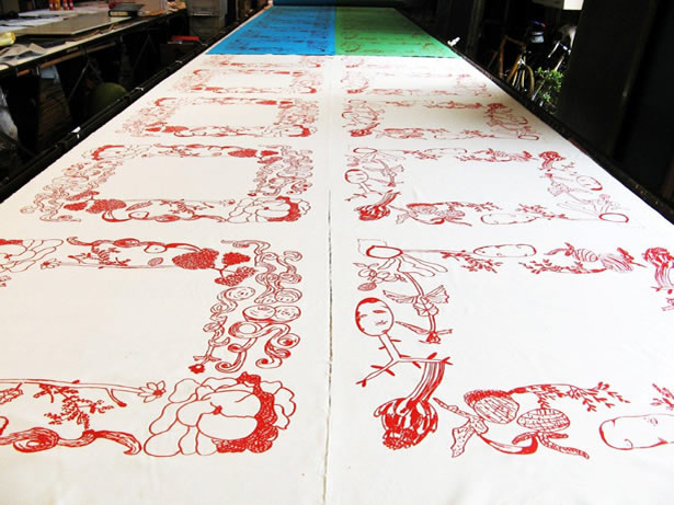 De tekeningen van de leerlingen verwerkte ik in twee dessins met een reliëf- inkt. In het midden zeefdrukten de leerlingen zelf hun eigen plantontwerp uit De Kas. Ook zeefdrukten ze hun plantontwerp op vijf banieren die tijdens Festival Bloei in Park Frankendal te bewonderen waren.