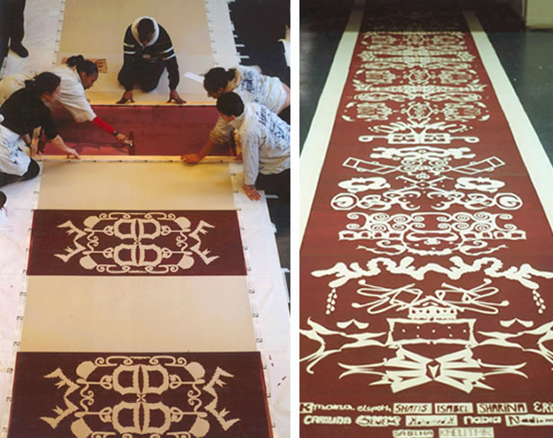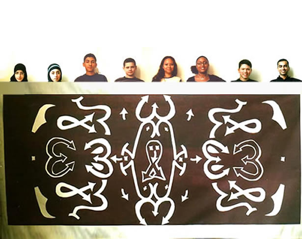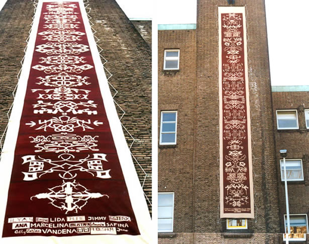 32 leerlingen gebruiken hun initialen als uitgangspunt voor het ontwerp. Op de twee banieren zijn twintig horizontale ontwerpen gezeefdrukt die een paar keer herhaald worden op een symmetrische manier. De kleurkeuze is gebaseerd op de meest oorspronkelijke kleuren in het gebouw.